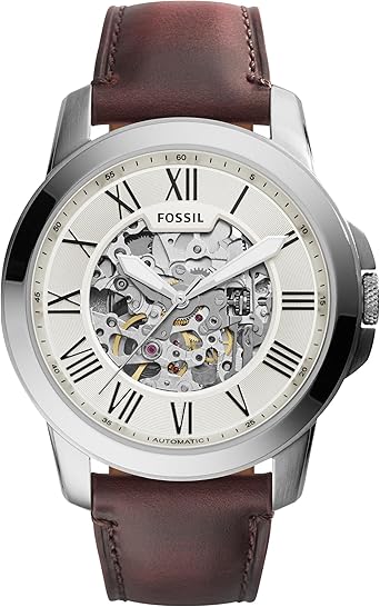 This sleek self-winding Fossil Grant automatic watch features a durable 45mm case, skeleton dial, and a refined genuine leather band for timeless everyday style. With scratch-resistant mineral glass and 50m water resistance.
